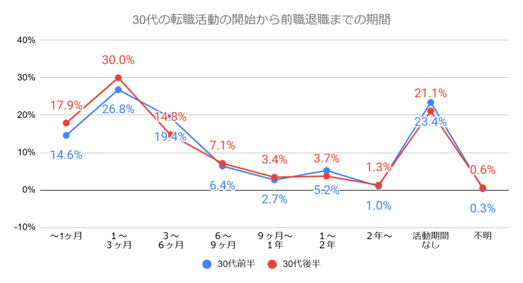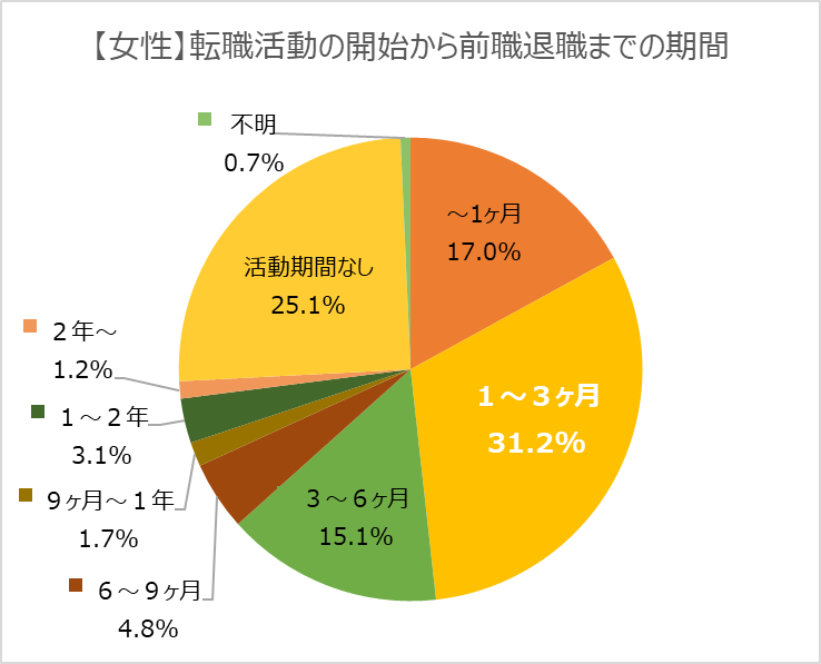 厚生労働省の調査によると、「転職活動を始めてから直前の勤め先を辞めるまでの期間」は全体では「1ヶ月以上3ヶ月未満」が一番多く28.8%で、女性のみでは31.2%でした。