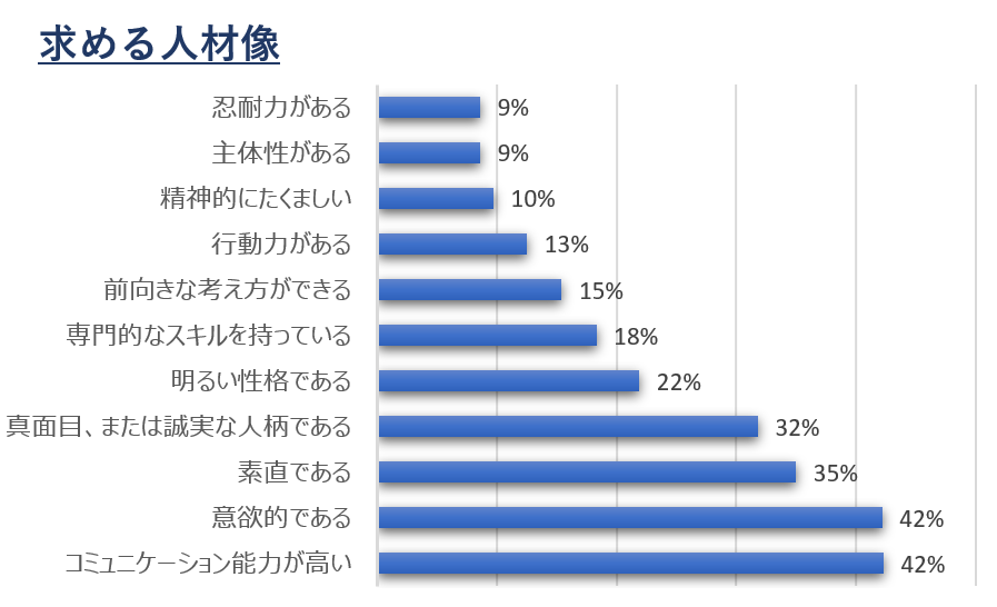 2022年9月の株式会社帝国データバンクの調査によると、企業が求める能力のなかで最も多かったのが「コミュニケーション能力が高い」で、全体で42.3%でした。
